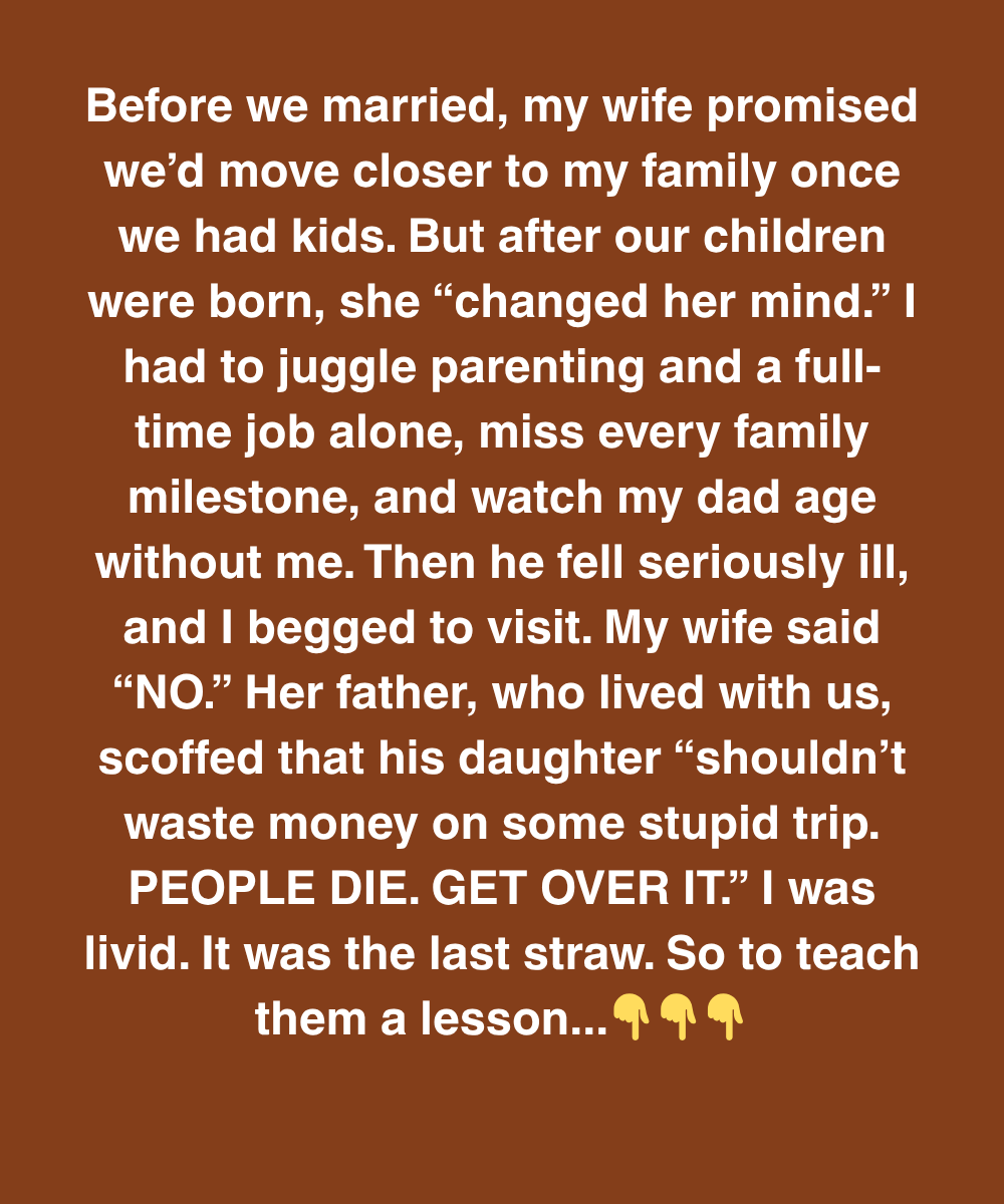 Before we married, my wife promised weโd move closer to my family once we had kids. But after our children were born, she โchanged her mind.โ I had to juggle parenting and a full-time job alone, miss every family milestone, and watch my dad age without me. Then he fell seriously ill, and I begged to visit. My wife said โNO.โ Her father, who lived with us, scoffed that his daughter โshouldnโt waste money on some stupid trip. PEOPLE DIE. GET OVER IT.โ