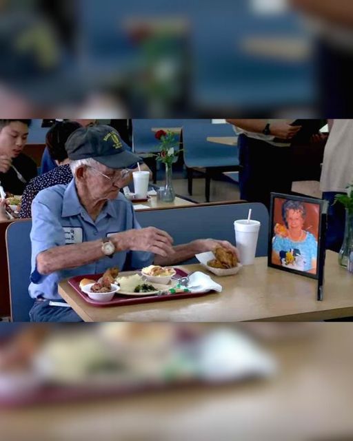 The diner was busy, full of chatter and clinking silverware, but he sat quietly at his table for two. One tray. Two plates. One for him, and one carefully placed in front of a framed photograph.