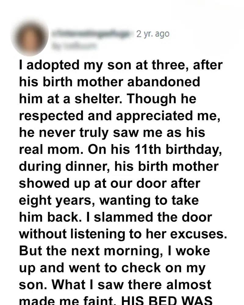 I adopted my son at three, after his birth mother abandoned him at a shelter. Though he respected and appreciated me, he never truly saw me as his real mom. On his 11th birthday, during dinner, his birth mother showed up at our door after eight years, wanting to take him back. I slammed the door without listening to her excuses.