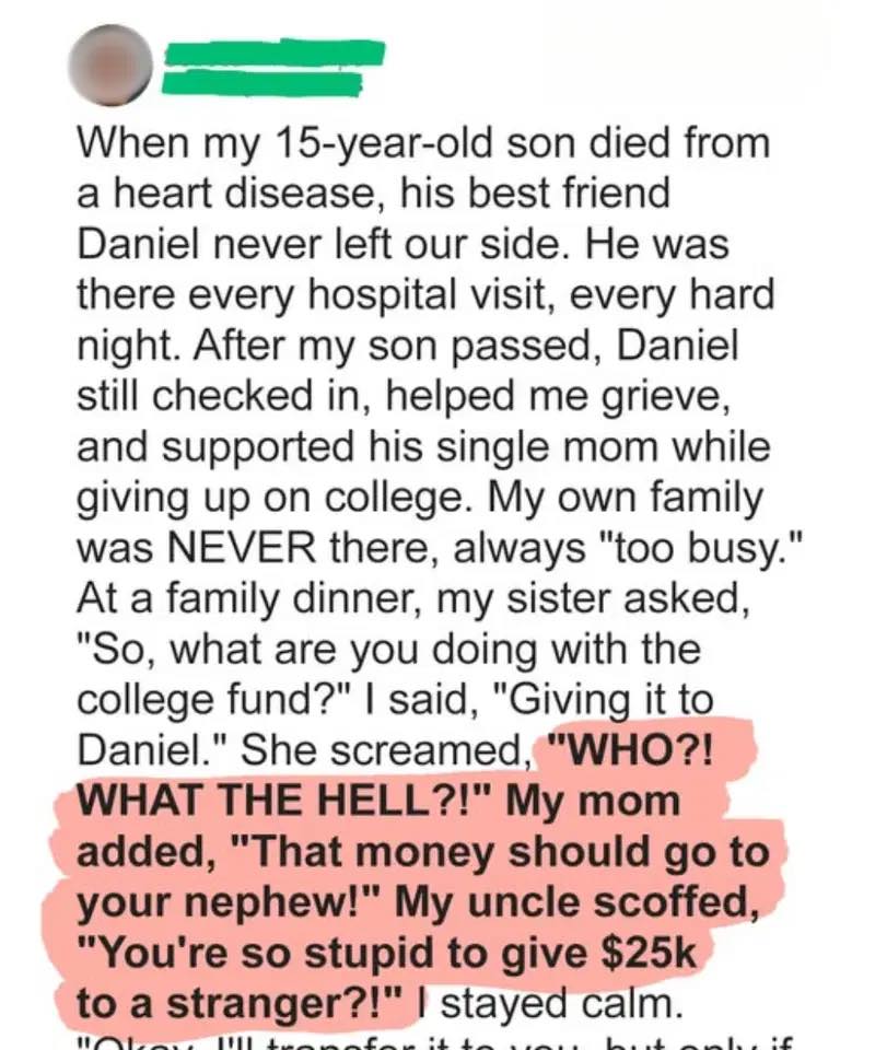 At a family dinner, my sister asked, “So, what are you doing with the college fund?” I said, “Giving it to Daniel.” She screamed, “WHO?! WHAT THE HELL?!” My mom added, “That money should go to your nephew!” My uncle scoffed, “You’re so stupid to give $25k to a stranger?!” I stayed calm.