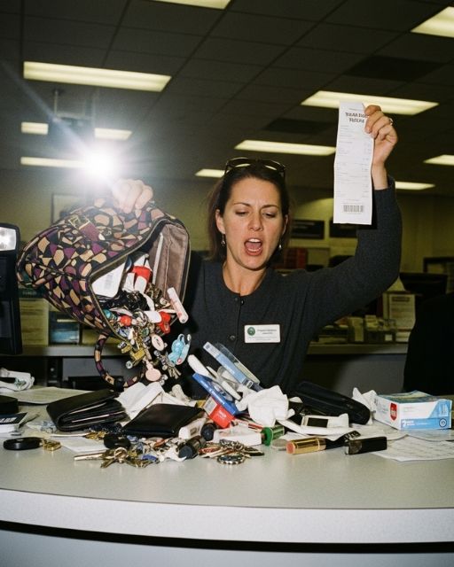 She slammed her bag down like she was defusing a bomb, then flipped it inside out—keys, lipsticks, a tampon, even a half-eaten granola bar hit the counter.